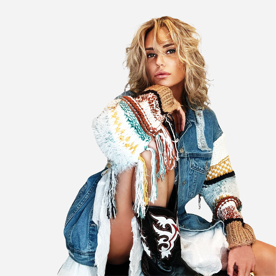 Oversized fit, unique handmade piece, imported denim jacket long knitted sleeves, hand-painted phrase in bold black lettering, denim jacket & front button closures.