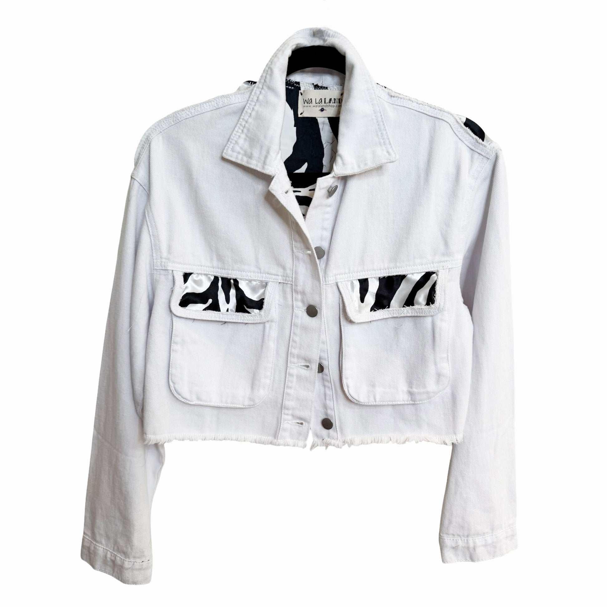 Constructed from top-tier denim and highlighted by silk with zebra print, this jacket boasts a relaxed, chic silhouette perfect for a stylish yet comfortable look.