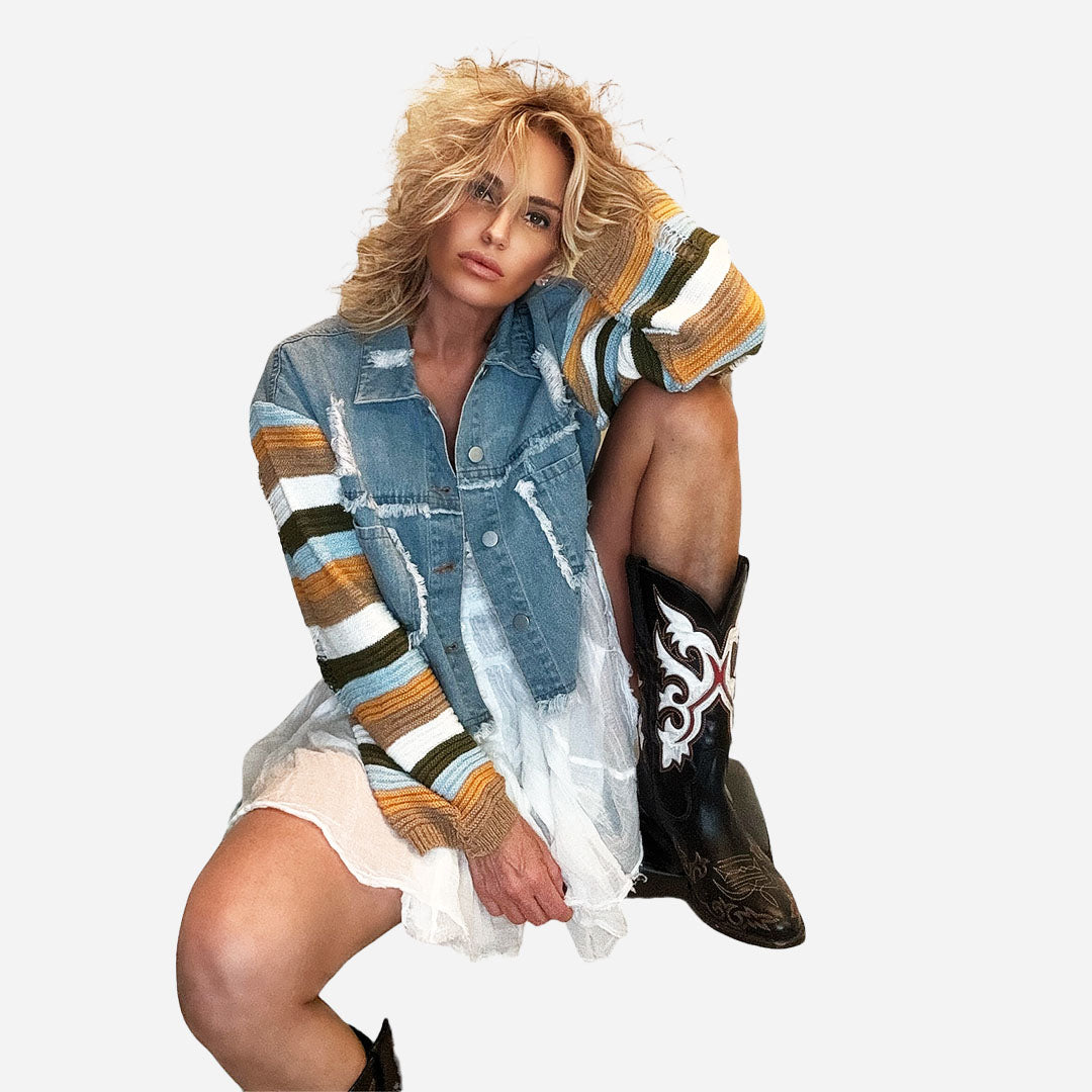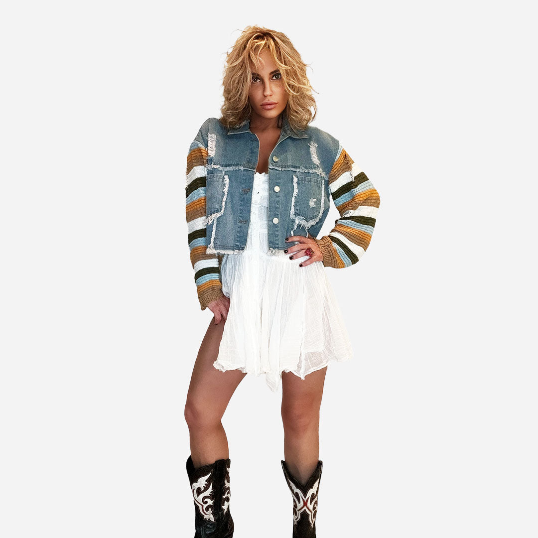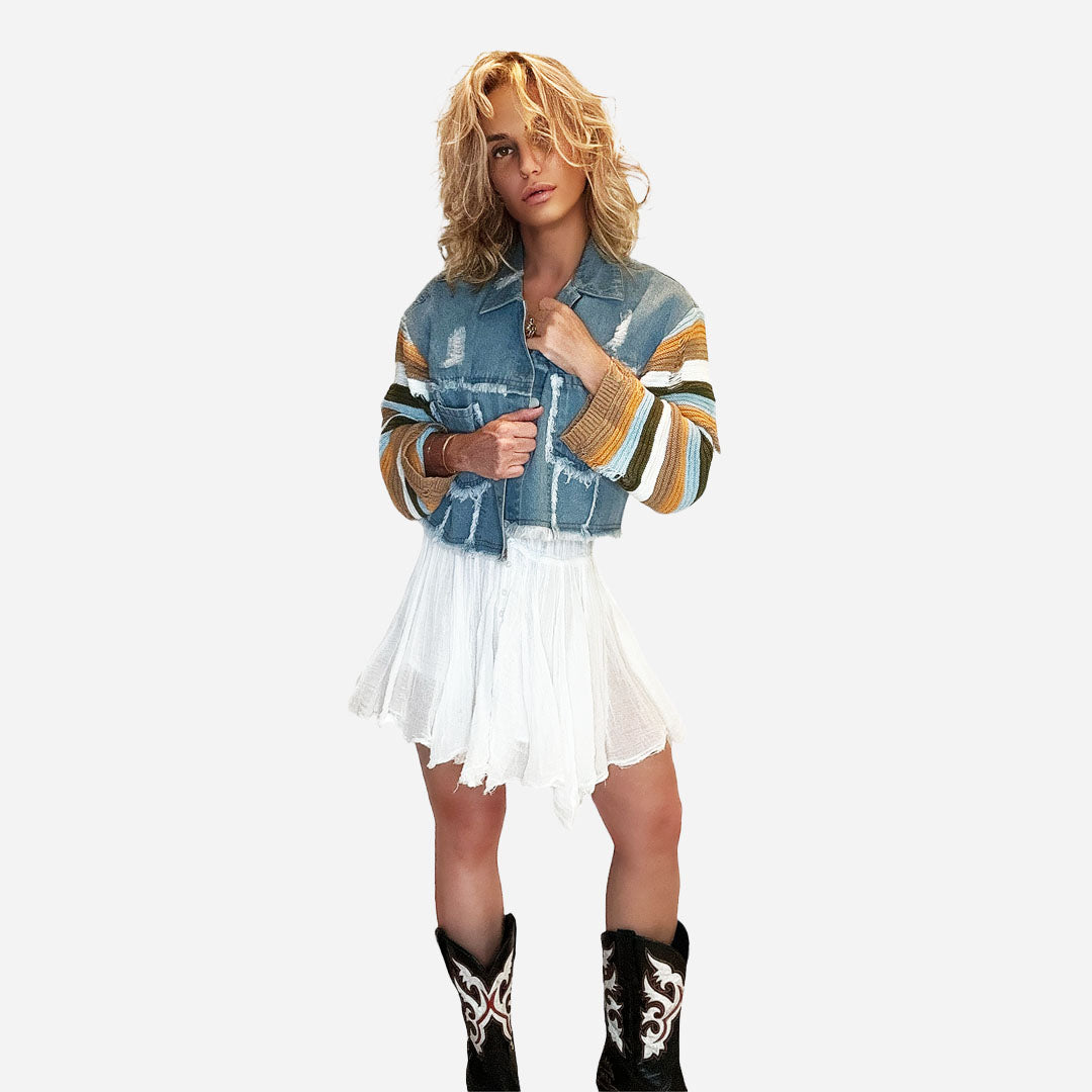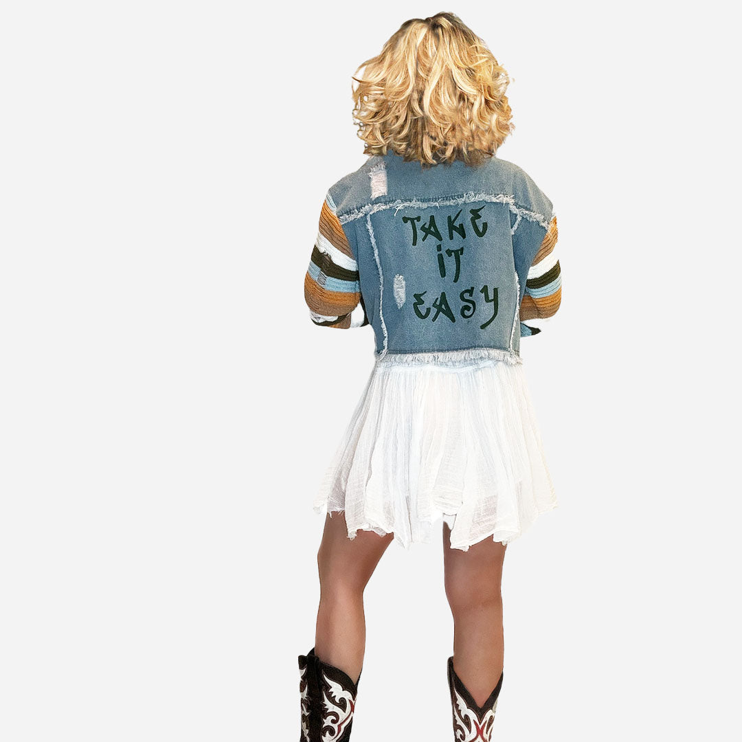 Embrace the effortless cool of the knit ripped sleeve denim jacket. with unique sleeves woven in a vibrant patchwork of orange, brown, beige, green, and blue, and handwritten phrase on the back in a rich moss green.