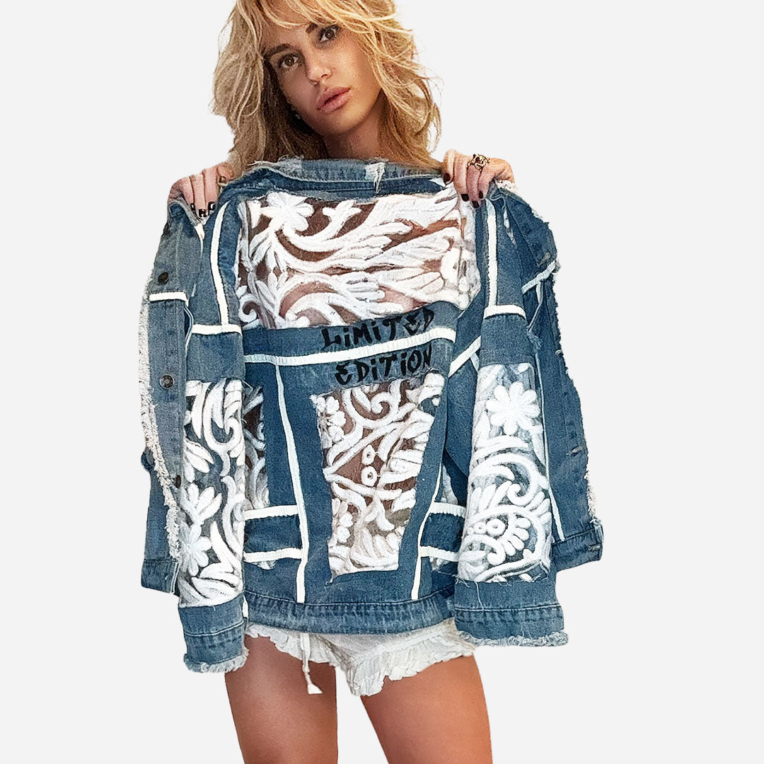 Unique handmade piece, denim jacket, imported with unique lace inserts for a touch of feminine elegance, front button closures, oversized fit collared, hand-painted accents in bold black and beige.