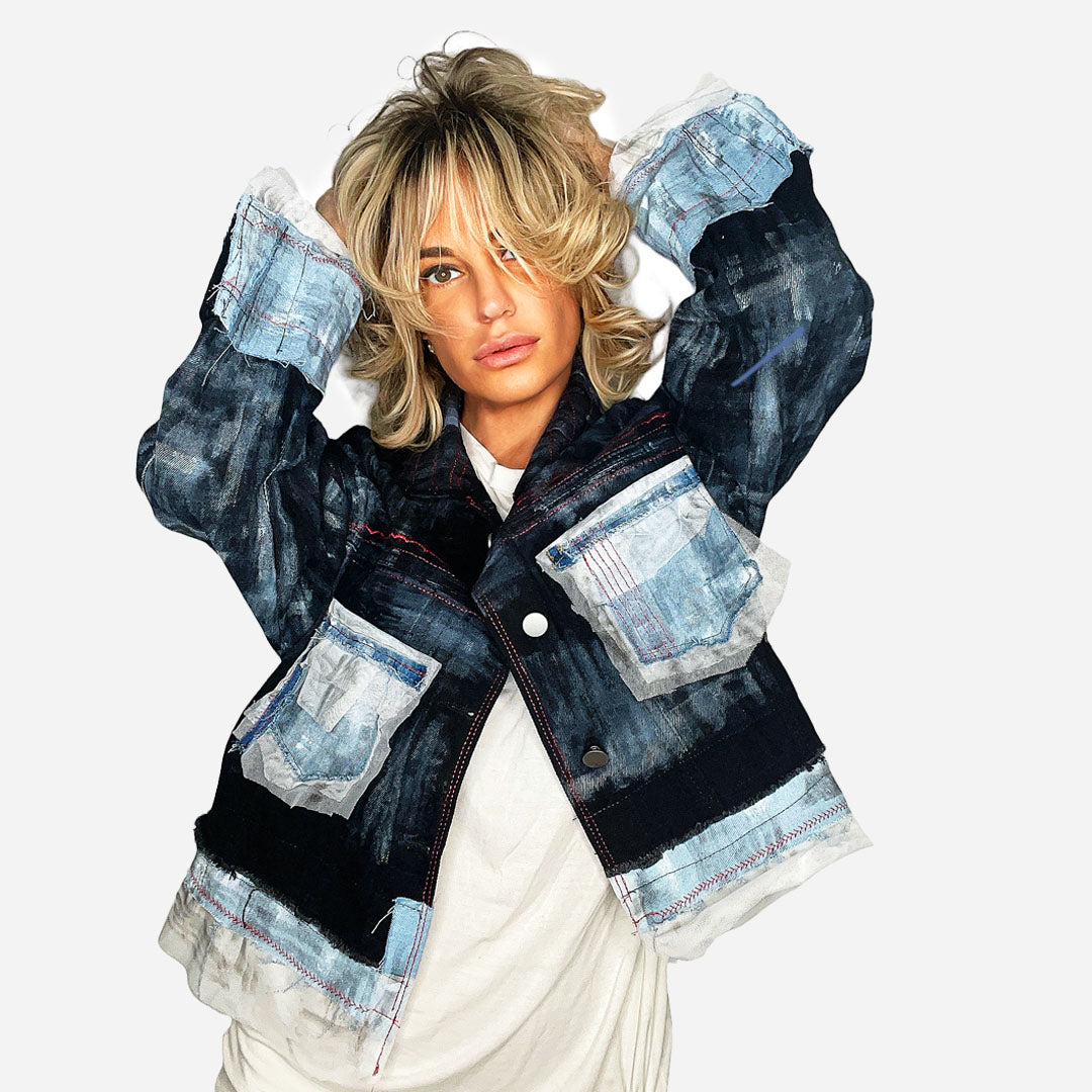 distinctive blend of black, worn blue denim, and white mesh fabric. pops of red thread seams add artisanal character, imported handmade denim jacket, unique handmade piece with brushstrokes in black and white tones that give a casual look. super loose fit.
