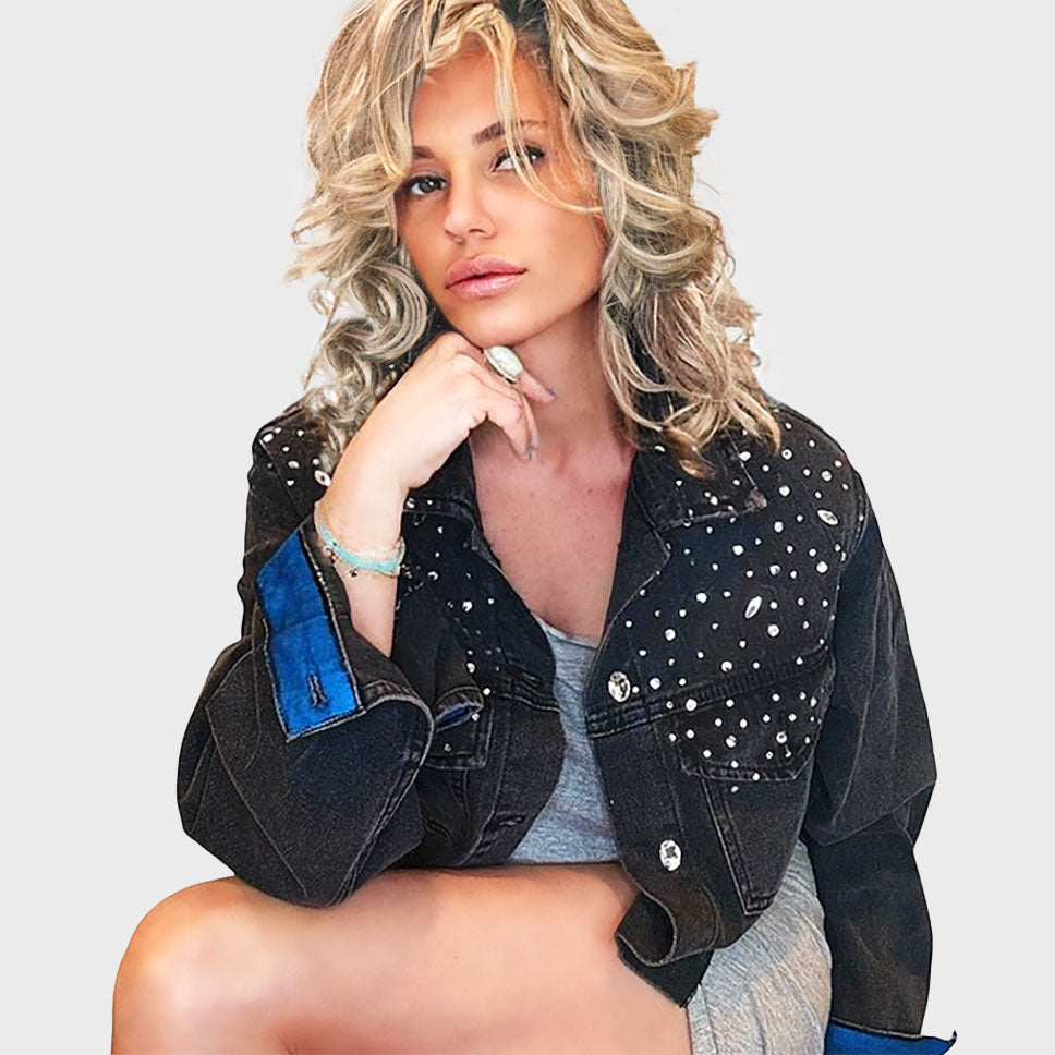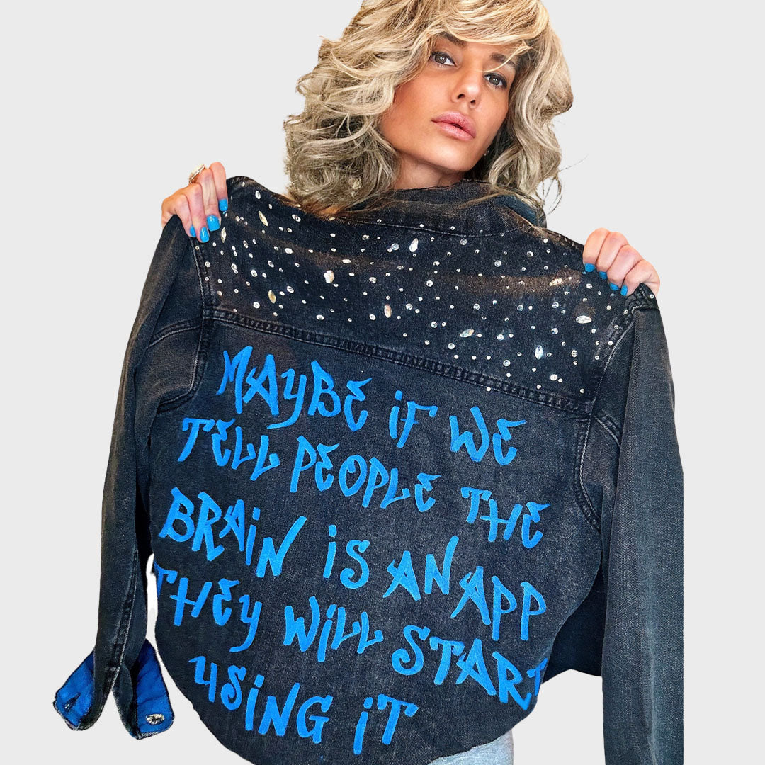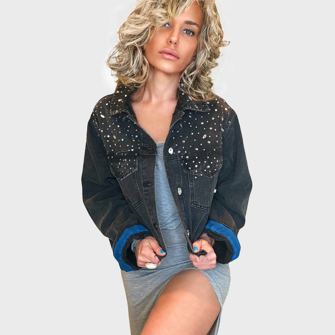 Raw, unfinished hem for a modern, edgy look. sparkling imitation diamond details front and back, signature phrase in bold royal blue for a pop of color, imported denim jacket.